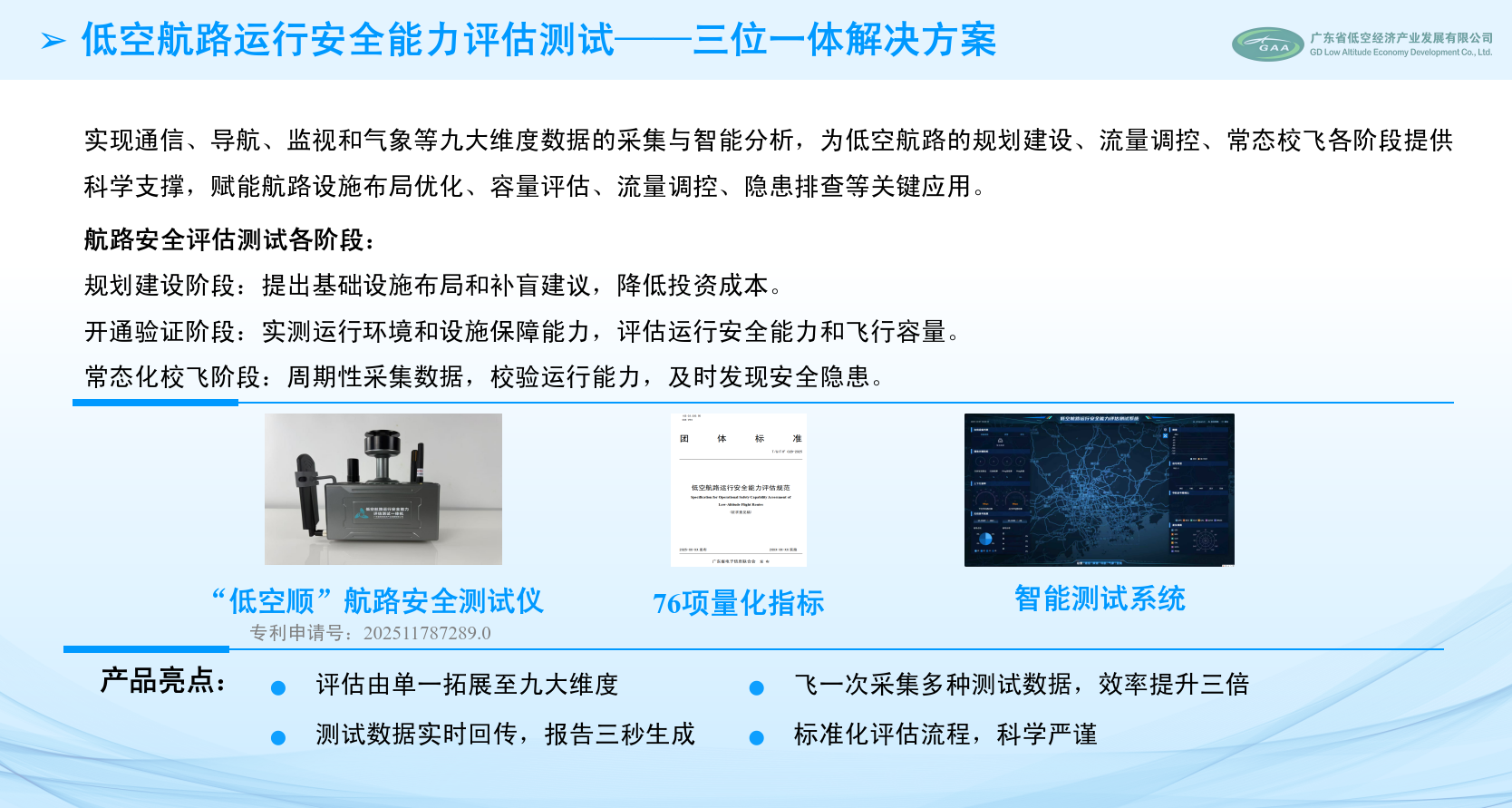 标准实施后,70余项量化指标为低空航路安全评估提供科学、可操作的标准支撑,可有效提升评估工作的规范性与精准度。依托评估结果科学测算航路容量,结合智能化调度与数字化管理,可实现低空飞行资源高效配置,助力运行安全有序、高效协同,持续提升广东省低空基础设施建设水平、安全保障能力与航路运行效能,为全省低空经济安全规范、高质量发展筑牢坚实根基。