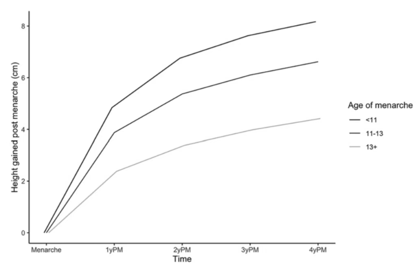 传统内分泌学观点认为女孩初潮后的身高增长平均约5-7.5 cm,但近些年也有部分研究结果提示月经初潮后身高增长量存在较大的个体差异,可能波动于0.2-31.1cm(对于这个结论目前还有争议),这主要受遗传、营养、初潮早晚(骨龄)等因素影响。